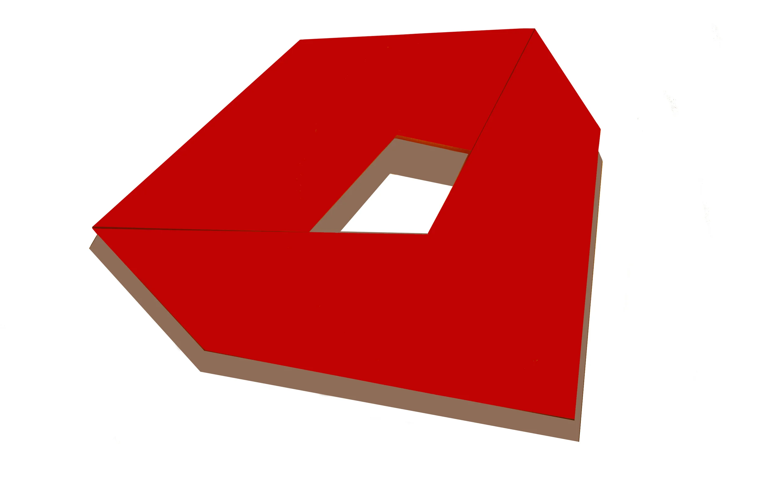 Working with shaped, stretched canvas, Mann constructs geometric figures which have built into them the illusion of greater space and dimension. And although they rest quietly against a wall, they seem to thrust both out and back into space with a movement and energy that comes from their design. “Metra”, a beautifully polished work in stainless steel, even in its title suggests pre-